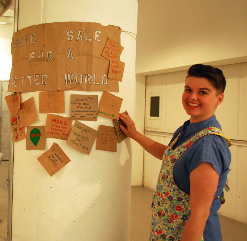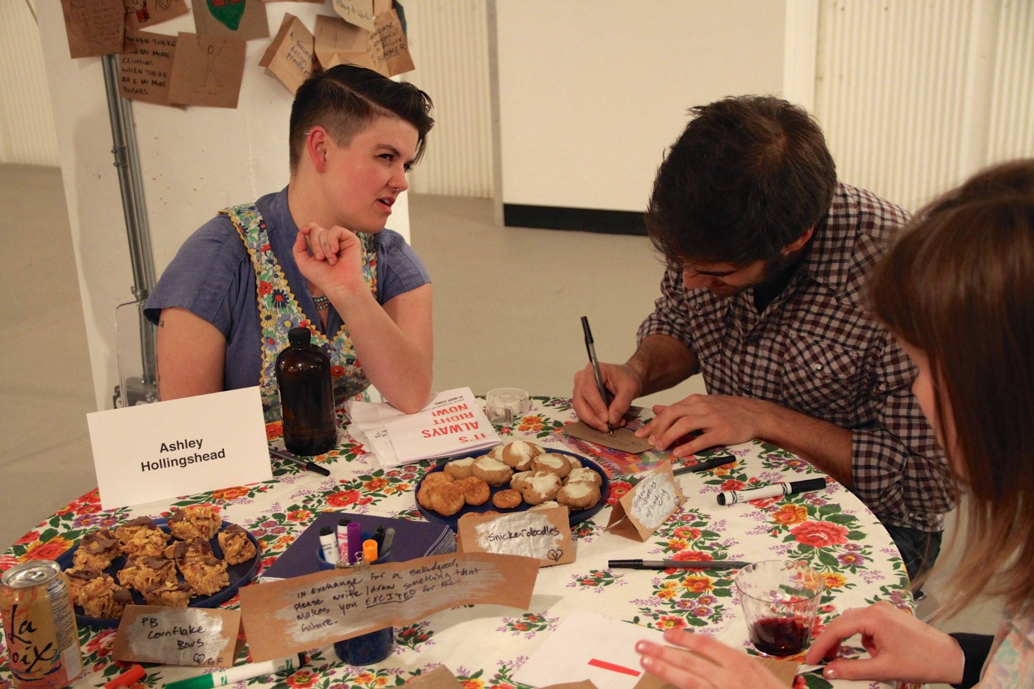 calling on the intertwined nostalgia and futility of bake sales, i asked participants to write or draw something that they are excited for about the future. in exchange i gave them a homemade baked good. no money was accepted.