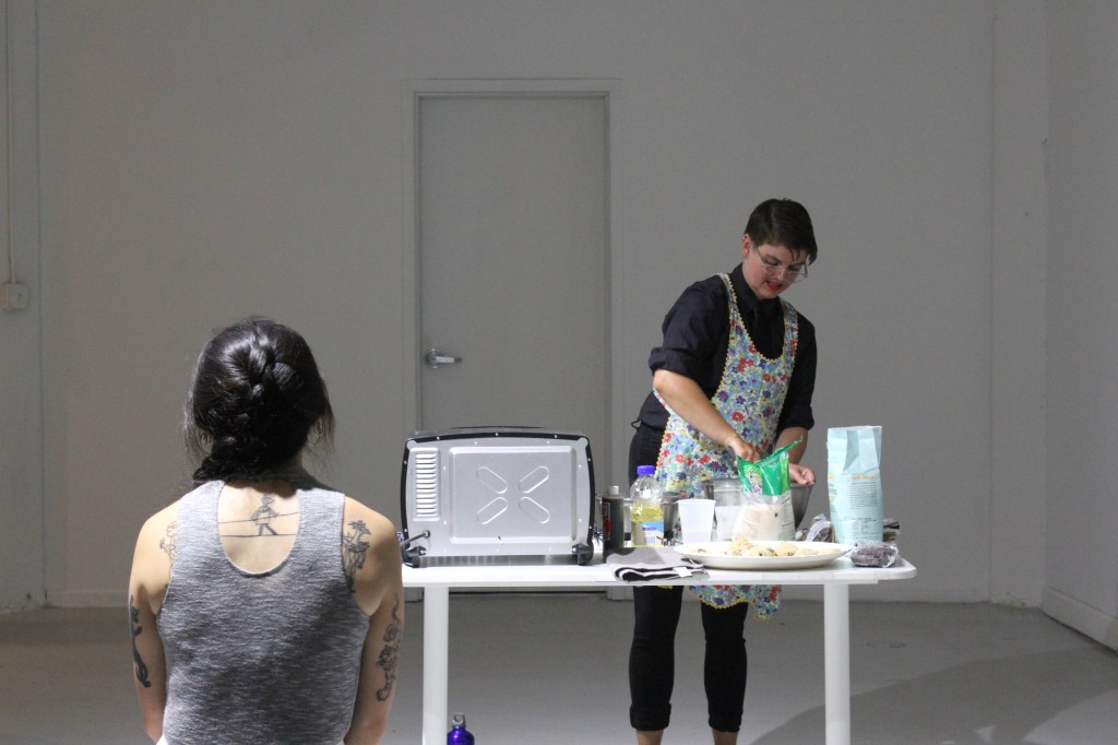 The smell of freshly baked cookies filled the basement level of the Zhou Brother’s Gallery, inviting audience in, to take a seat, have a cookie (or two) and share a story. Over the course of three hours, I baked dozens and dozens of chocolate chip cookies and engaged in organic dialogue with viewers exploring the ideas of family, food, community, and comfort.